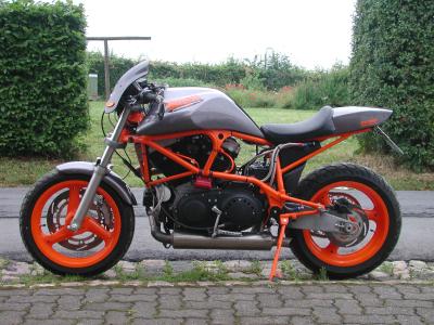 Das Heck welches am Prototyp noch aus Aluminium hergestellt ist werden wir nun bald in GFK anbieten, es ermöglicht eine schlanke Linienführung ohne den Rahmen, wie beim Verbau des S1 Hecks, kürzen zu müssen. Unser zugegeben voluminöser aber eben auch sehr leistungsfähiger Aluluftfilter in Verbindung mit dem Luckys Raceauspuff sind weitere Features deren Zusammenspiel wir an diesem Motorrad perfektioniert haben.